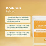 C-vitamiini on välttämätön vitamiini, joka edistää monia tärkeitä toimintoja elimistössä. Se tukee immuunijärjestelmän normaalia toimintaa ja on avainasemassa kollageenin muodostumisessa, joka on tärkeää iholle, luustolle, verisuonille, hampaille ja rustolle. Lisäksi se auttaa suojaamaan soluja hapetusstressiltä, edistää raudan imeytymistä ja auttaa vähentämään väsymystä ja uupumusta. C-vitamiini tukee myös hermostoa, energia-aineenvaihduntaa ja normaalia psykologista toimintaa.